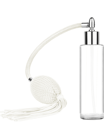 Item Description: Cylinder design 50 ml, 1.7oz clear glass bottle with White vintage style bulb sprayer with tasseland shiny silver collar cap. For use with cologne, Eau de Parfum, air freshner, face and body spray, or room spray. Antique or vintage bulb sprayers enhanc