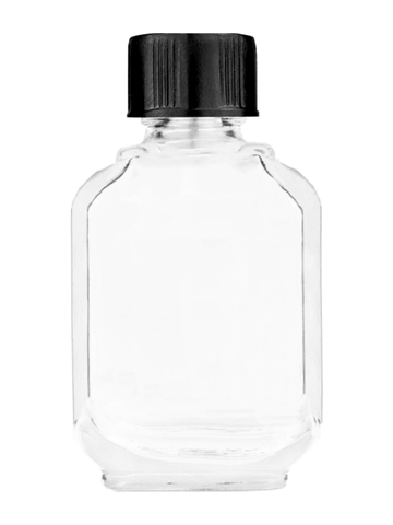 Item Description: Footed rectangular design 10ml, 1/3oz Clear glass bottle with short black cap. For use with perfume or fragrance oil, essential oils, aromatic oils and aromatherapy. Refillable, classic style bottle good for promotions and decants. Price each
