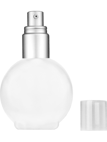 Item Description: Round design 78 ml, 2.65oz frosted glass bottle with with a matte silver collar treatment pump and clear overcap. For use with serums, light creams, moisturizers, facial oils or face oils, beard oils, body lotions, body wash, and hair products. Round desi
