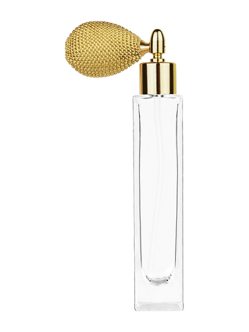 Item Description: Sleek design 50 ml, 1.7oz clear glass bottle with gold vintage style sprayer with shiny gold collar cap. For use with cologne, Eau de Parfum, air freshner, face and body spray, or room spray. Antique or vintage bulb sprayers enhance the beauty of your